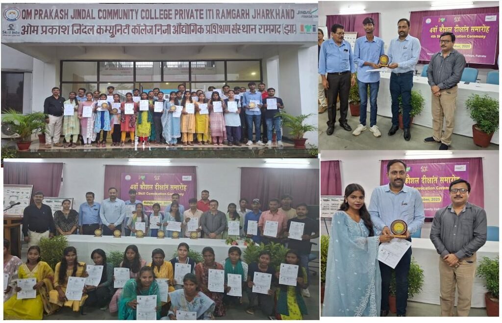 भुरकुंडा (रामगढ़)। ओपी जिंदल कम्युनिटी कॉलेज पतरातू में शनिवार को भव्य दीक्षांत समारोह का आयोजन किया गया। इस अवसर पर सत्र 2023-25 एवं 2024-25 के प्रशिक्षणार्थियों को अगस्त 2025 में आयोजित परीक्षा में सफलता प्राप्त करने पर प्रमाण-पत्र और मोमेंटो देकर सम्मानित किया गया। समारोह के मुख्य अतिथि जिंदल स्टील पतरातू डब्लूआरएम के संतोष कुमार गुप्ता तथा विशिष्ट अतिथि सीएसआर प्रमुख कुमार राहुल उपस्थित थे। कार्यक्रम की अध्यक्षता संस्थान के प्राचार्य संबित कुमार साहू ने की।