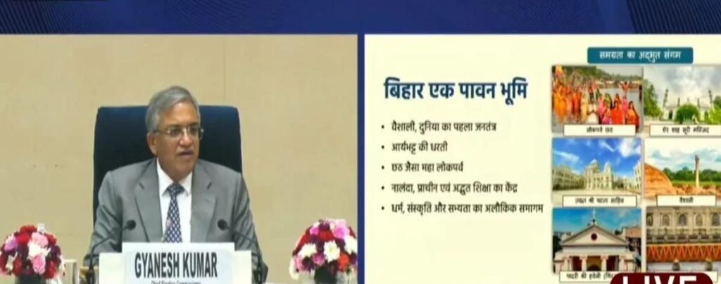 दिल्ली । बिहार विधानसभा चुनाव का बिगुल बज चुका है। मुख्य चुनाव आयोग ज्ञानेश कुमार ने प्रेसवार्ता कर बिहार चुनाव का ऐलान किया है। बिहार में दो चरणों में विधानसभा चुनाव होगा। छह नवंबर और 11 नवंबर को चुनाव होगा जबकि मतगणना 14 नवंबर को होगी। बिहार चुनाव को लेकर मुख्य चुनाव आयुक्त ज्ञानेश कुमार समेत कई चुनाव अधिकारी शाम चार बजे से प्रेस कॉन्फ्रेंस कर रहे हैं। चुनाव की घोषणा होते ही पूरे बिहार में आदर्श चुनाव आचार संहिता लागू हो गई है।