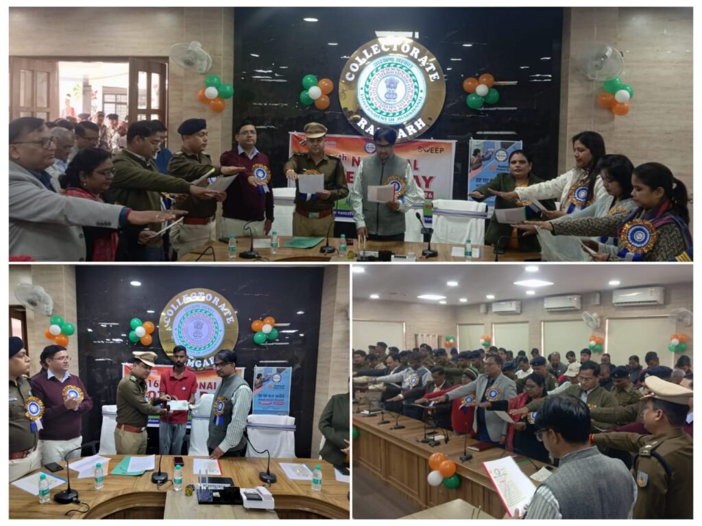 और प्रत्येक नागरिक को अपने मताधिकार का निर्भीक, निष्पक्ष एवं जिम्मेदारी के साथ प्रयोग करना चाहिए। उन्होंने अधिक से अधिक लोगों को मतदान के प्रति जागरूक करने और लोकतांत्रिक परंपराओं को सुदृढ़ करने की अपील की। राष्ट्रीय मतदाता दिवस के उपलक्ष्य में रामगढ़ जिला अंतर्गत सभी जिला स्तरीय एवं प्रखंड स्तरीय कार्यालयों में भी शपथ ग्रहण कार्यक्रम का आयोजन किया गया, जिसमें अधिकारियों एवं कर्मियों ने भाग लेकर मतदाता जागरूकता एवं लोकतांत्रिक मूल्यों के संरक्षण का संकल्प लिया।