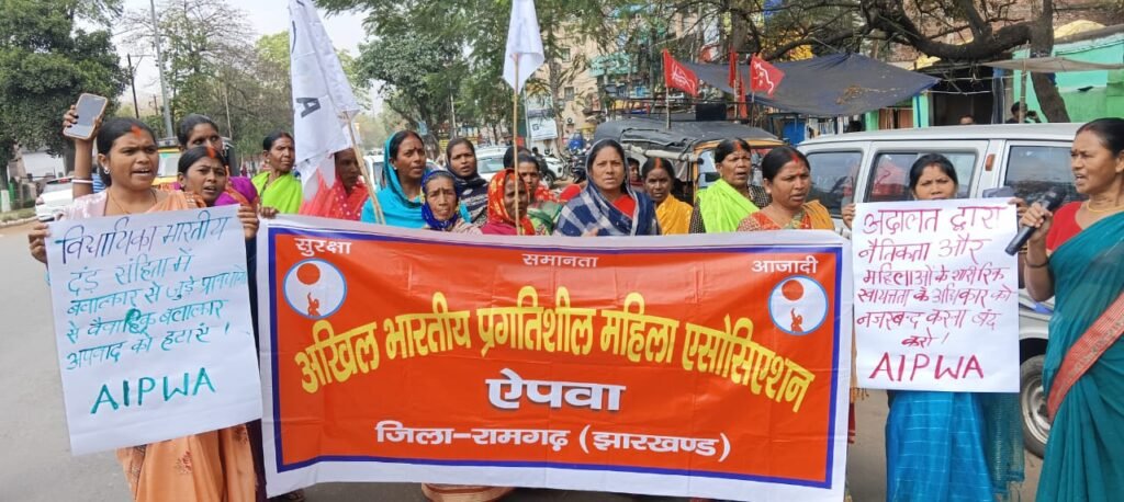 रामगढ़। अखिल भारतीय प्रगतिशील महिला एसोसिएशन(ऐपवा) रामगढ़ जिला इकाई के नेतृत्व में रामगढ़ शहर में मार्च निकाला गया. जिसमें नीता बेदिया, कांति देवी, सोनी कुमारी, जयंती देवी,आशा देवी, सीता देवी,वीणा देवी,संगीता देवी, कुंती देवी,कदमी देवी,मालती देवी,बसंती देवी,रमनी देवी, सलोनी देवी,रुपनी देवी,रुदनी देवी अन्य दर्जनों महिलाएं शामिल थी।