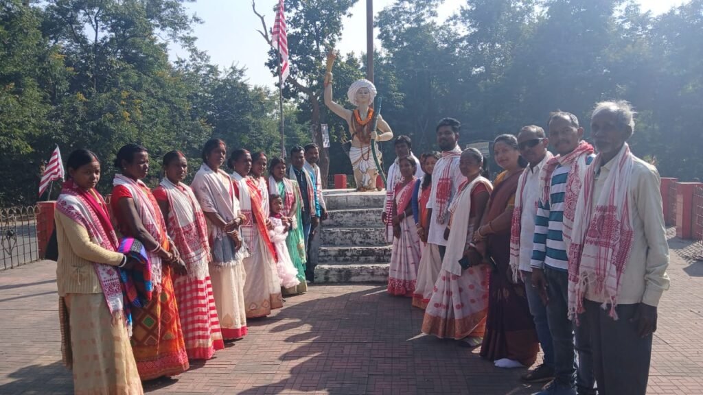 अरगड्डा बैगामोड़ में राजी पड़हा सरना प्रार्थना सभा के सदस्यों ने आदिवासी सभा में जाने से पूर्व बिरसा मुंडा की प्रतिमा पर किया माल्यार्पण