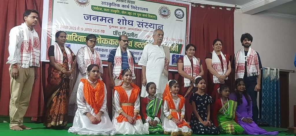 रजरप्पा। सांस्कृतिक कार्य निदेशालय, पर्यटन कला संस्कृति खेलकूद एवं युवा कार्य विभाग झारखंड सरकार के आदेश से “जनमत शोध संस्थान ,दुमका” द्वारा आयोजित पाँच दिवसीय लोककला एव हस्तशिल्प प्रदर्शनी में जनमत शोध संस्थान के सचिव श्री अशोक सिंह द्वारा विशेष आमंत्रण पर हरिणा, बाघमारा, धनबाद के निवासी बिष्णु देव महतो “अलबेला” ने खोरठा ,मगही एवं असमिया तीन भाषाओं में लोकगीत की प्रस्तुति देकर विक्रमशिला विद्यापीठ के कुलपति डॉ रामजन्म मिश्र के हाथों अंग वस्त्र से सम्मानित हुए।